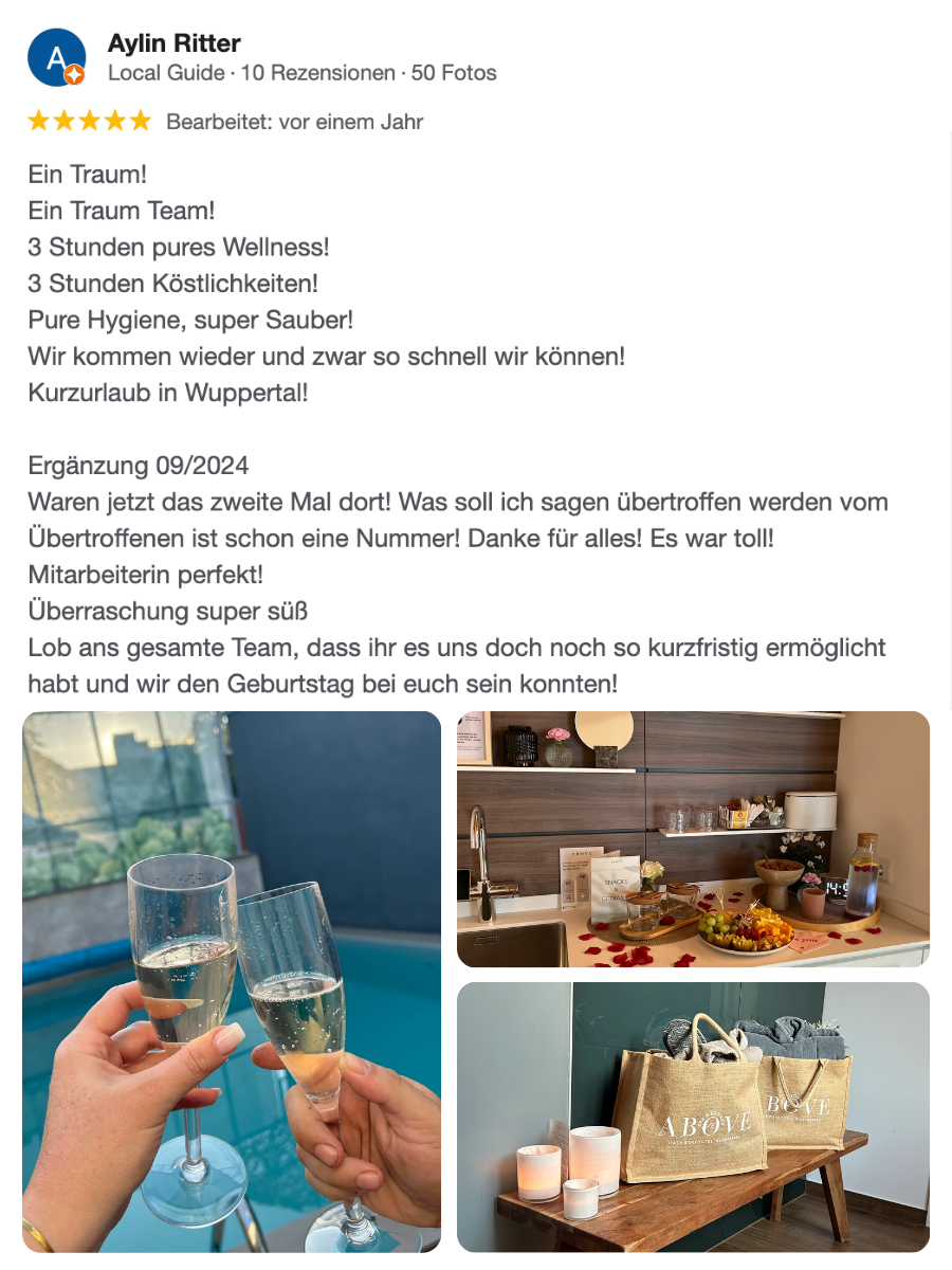 Nutzung aller Bereiche (Sauna, Pool, Whirlpool, Kaminlounge, Terrasse), Getränkespender und zwei kleine Handtücher. Je nach Paket kommen Sekt, Deko und Snacks dazu.